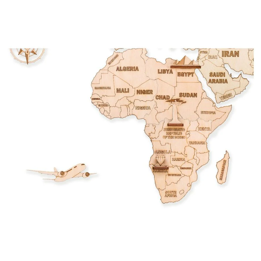 Wooden Travel world map is an original and unique gift for travelers, adventure lovers and explorers. A wooden wall map made of natural materials (high-quality plywood; no glue or cutting required). With WoodTrick's travel wall world map you can learn geographic and have fun with kids.