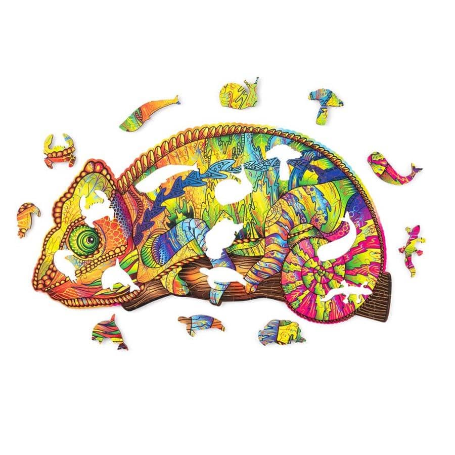 The Wood Trick Colourful Chameleon Puzzle is a stunning premium wooden jigsaw puzzle featuring vibrant artwork and beautifully detailed laser-cut pieces. Made from eco-friendly wood, this puzzle includes intricate cut patterns and uniquely shaped whimsy pieces, including animals, leaves and abstract designs, enhancing both challenge and visual enjoyment.
